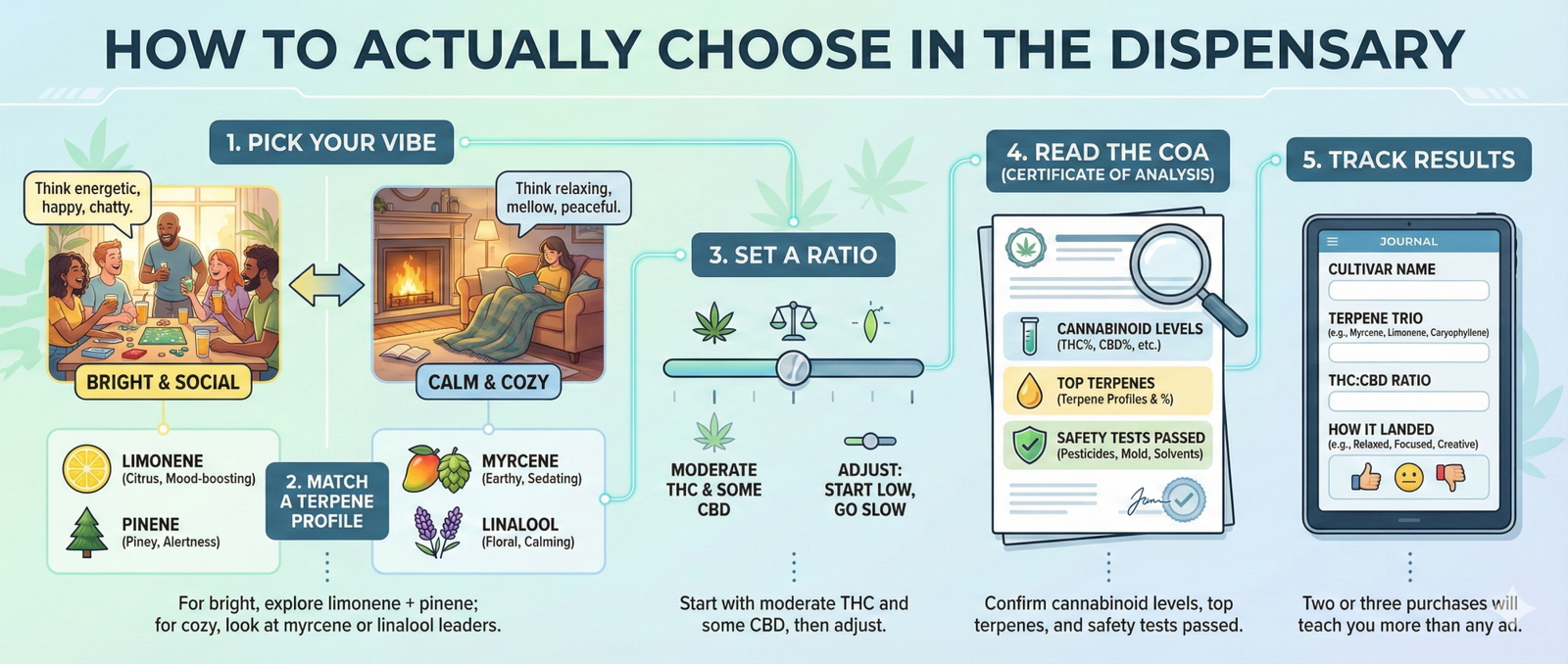 - Track results: cultivar name, terpene trio, THC:CBD, how it landed. Two or three purchases will teach you more than any ad.